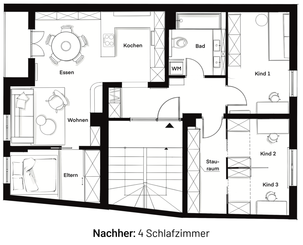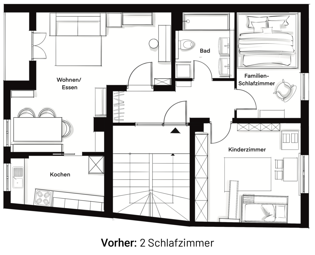 Mehr Platz durch Verlegung des Schlafzimmers in die Küche: Die ehemalige Küche wird zum Rückzugsort der Eltern und die Küche einfach in den Wohnraum verlegt. Das ist möglich, da das Bad direkt an den Wohnraum angrenzt.